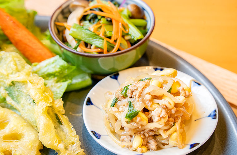 副菜は週替わり。旬のもの、その時に“本当に食べたいもの”を大切にしているため、訪れるたびに内容が変わります。地元野菜を積極的に取り入れ、素材そのものの味わいを引き立てる味付けに。軽やかな衣をまとった天ぷらは、野菜の甘みが感じられます。