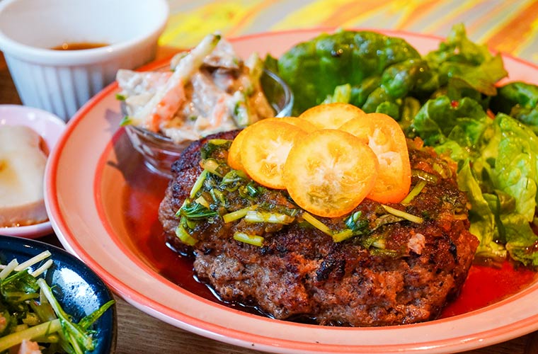 取材日のメインは「ハンバーグの香味ソース」。家庭料理の定番・ハンバーグを、ソースでもポン酢でもない同店オリジナルの香味ソースで仕上げ、トップには三つ葉と実家で採れた無農薬のキンカンのスライスをあしらった、同店らしい一品です。