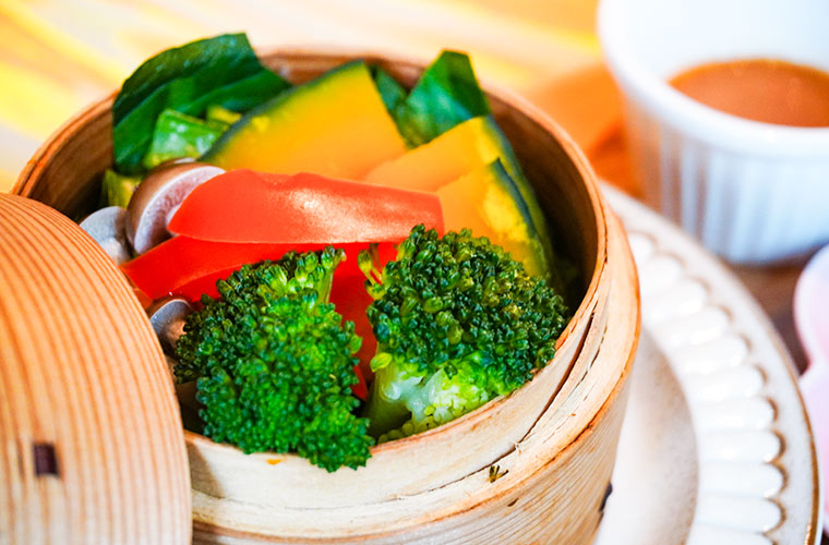 小さなせいろの中には、ブロッコリーやパプリカ、カボチャなど、旬の野菜がぎゅっと詰まっています。食べるときは、店主オリジナルブレンドのゴマだれに付けて味わって。