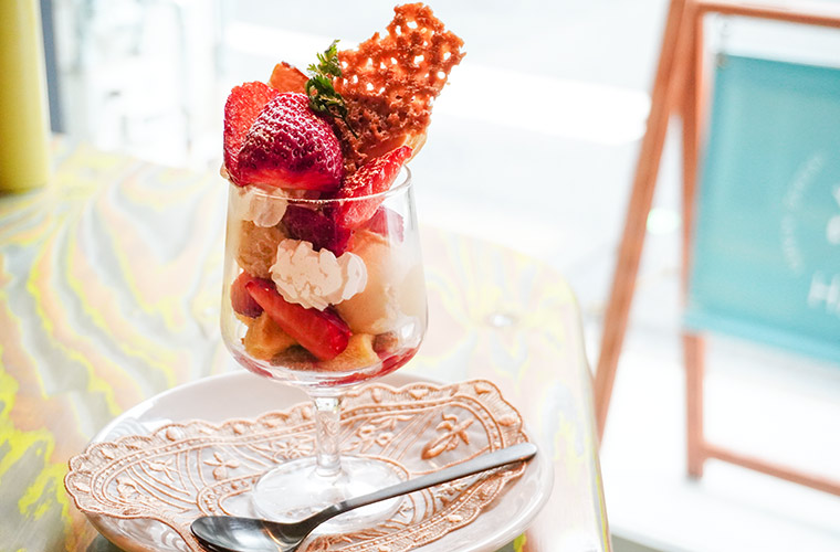 人気のパフェは、季節限定と定番の『チョコレートパフェ』(800円)がスタンバイ。取材日の季節限定は、旬のイチゴを使った『いちごパフェ』でした。キャラメルとバニラの2種類のアイスクリームに、自家製チーズケーキとイチゴを重ねた魅惑の一品です。食べ進めると、グラスの底にはサクサク食感のクランチクッキーが隠れていて、食べるたびに楽しい食感の変化が味わえます。