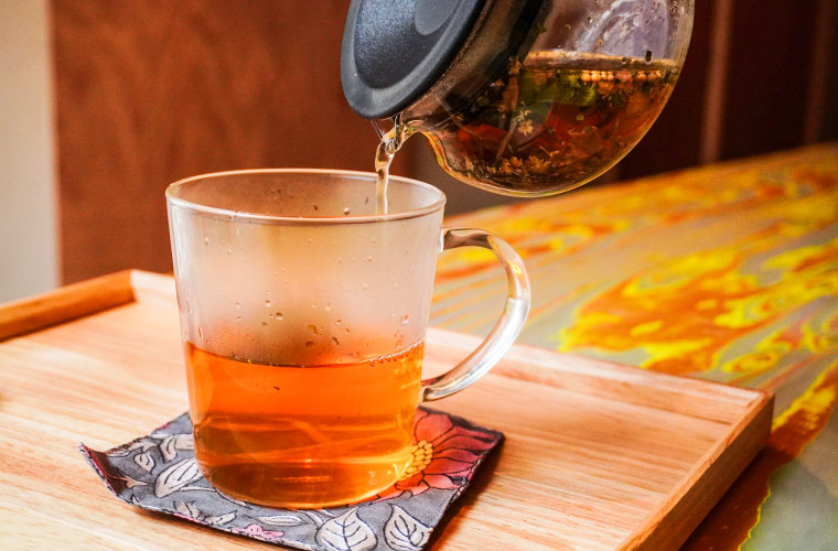姫路市のハーブ専門店「sorali(ソラリ)」のハーブティーも用意。数あるハーブティーの中から、季節に合わせたものをセレクトし、ポットで提供しています。この日は、スペアミントの爽やかな香りが鼻に抜ける「スプリングブレンド」が登場。日々の疲れを癒やしてくれること間違いなしです。