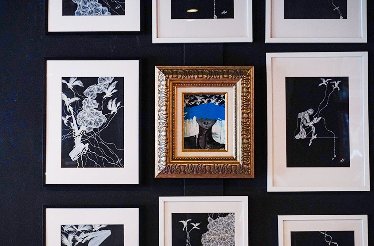 オーナーの奥さん・Cyd(シド)さんは、ペンとインクによるドローイング、アクリル絵画、そして詩の執筆など、幅広いジャンルのアートを手がけるアーティスト。作品の一枚一枚には物語が宿り、卓上に置かれた一冊の本には、それぞれの作品に込めた思いが書き留められています。