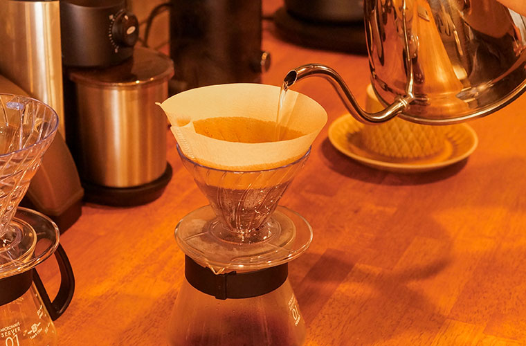 豆の種類は全部で6種類。広島から仕入れた豆を注文が入ってから挽(ひ)き、一杯ずつ丁寧にハンドドリップで淹れています。