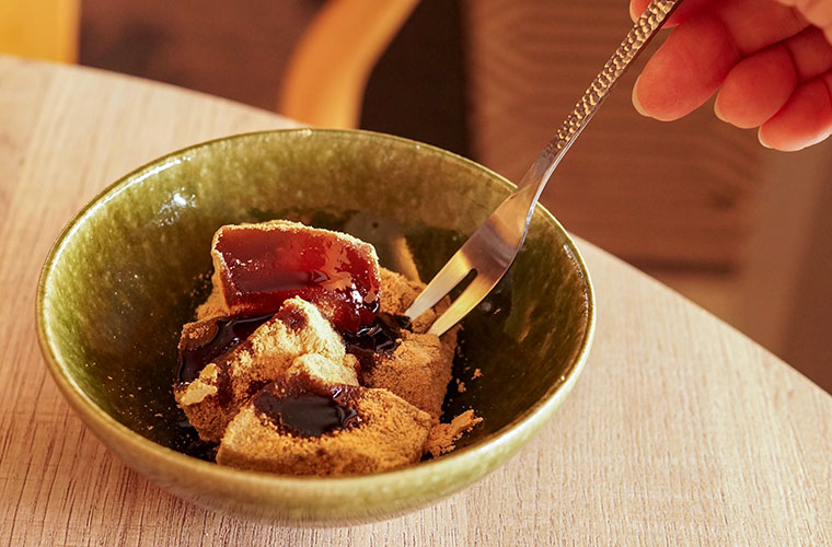 仕上げに黒蜜をとろりとかければ、きなこの香ばしさと黒糖のコク、黒蜜の甘みが重なり合い、繊細で奥行きのある味わいに。和菓子好きにはたまらない、上品なおいしさを楽しんで。