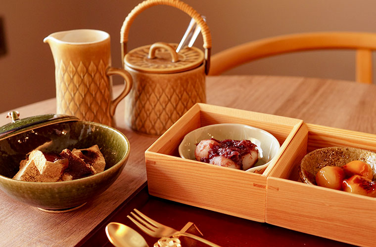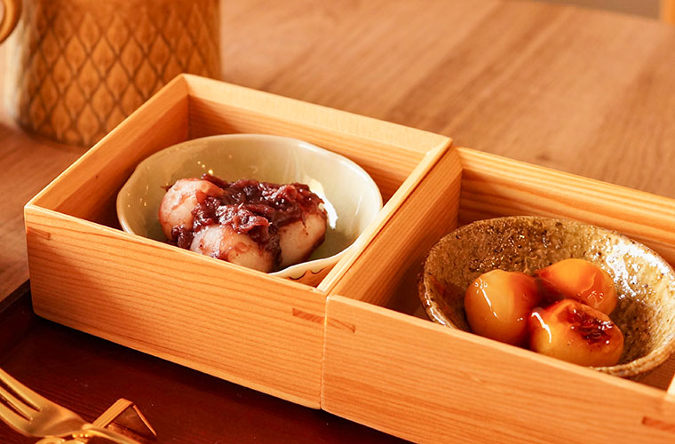取材日の和菓子には、「みたらし」と「つぶあん」の2種類の『だんごと』が登場。木箱に入った和菓子は、見た目からも特別感たっぷり。ふたを開ける瞬間のわくわく感も、このセットならではのお楽しみです。
