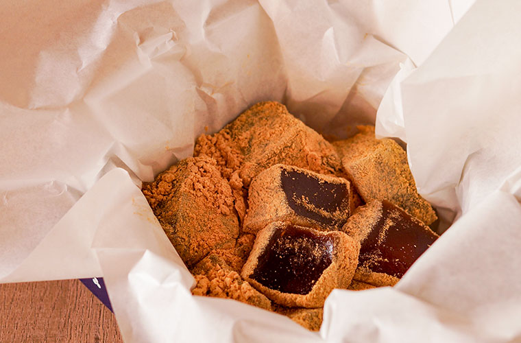 黒糖を使った『恋文わらび』も店主イチオシの一品。黒糖ならではのコクがあり、口に入れると優しくとろけるような口溶けです。たっぷりとまぶされたきなこには、広島の老舗きなこ屋「ウエマン」のものを使用。香ばしく素朴な味わいが、黒糖の濃厚な甘みと絶妙に調和します。
