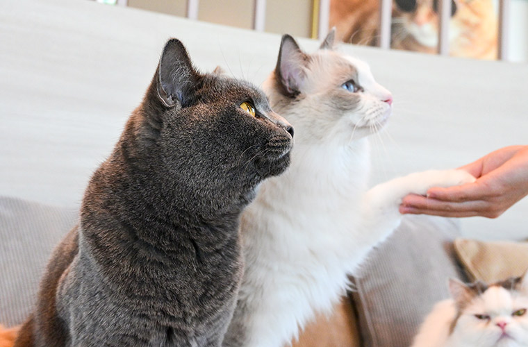 おやつタイムになると真っ先に駆け寄ってくるラグドールのジルくん(写真右)。整った顔立ちで人気を集めるだけでなく、「お手」をマスターした賢さも魅力です。
