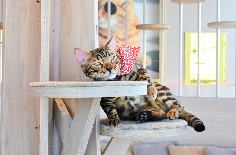 中央にあるシンボルツリーは、猫ちゃんたちの憩いの場。木には猫ちゃんが上り下りできるステップが設けられていて、体が小さく床ではほかの猫ちゃんに埋もれてしまう子たちは、ここからおやつをねだることも多いのだとか。