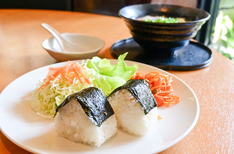 店主おすすめのモーニングは、なんと「讃岐うどん」。アツアツのうどんにおにぎり2個orホットドッグとサラダが付いた、朝からしっかり食べたい人にぴったりのセットです。優しい甘めの出汁が、朝の体にじんわり染み渡ります。