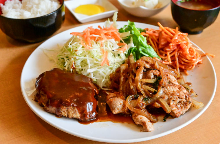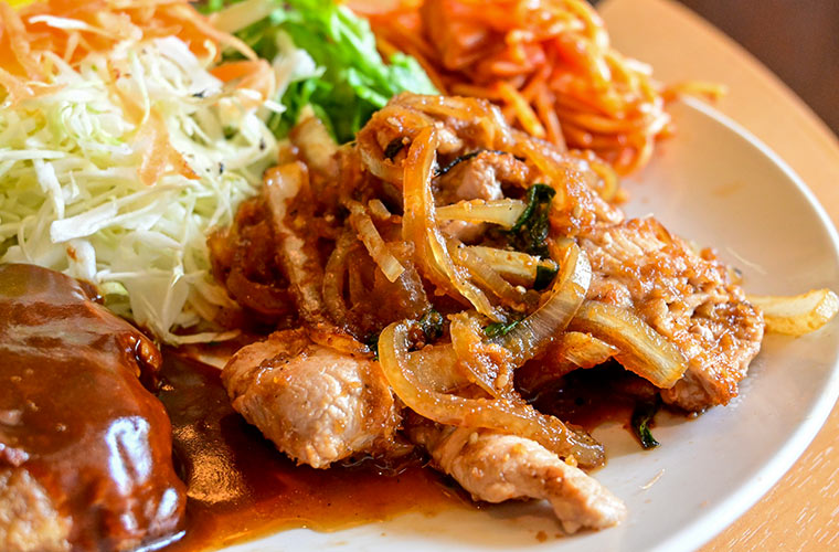 ハンバーグは肉のうま味とタマネギの甘みがしっかり感じられる本格派。生姜焼きは国産生姜をすりおろして使っていて、香りと辛味がしっかり利いた味わい。タレが染みたタマネギと一緒に食べれば、ご飯が止まりません!
