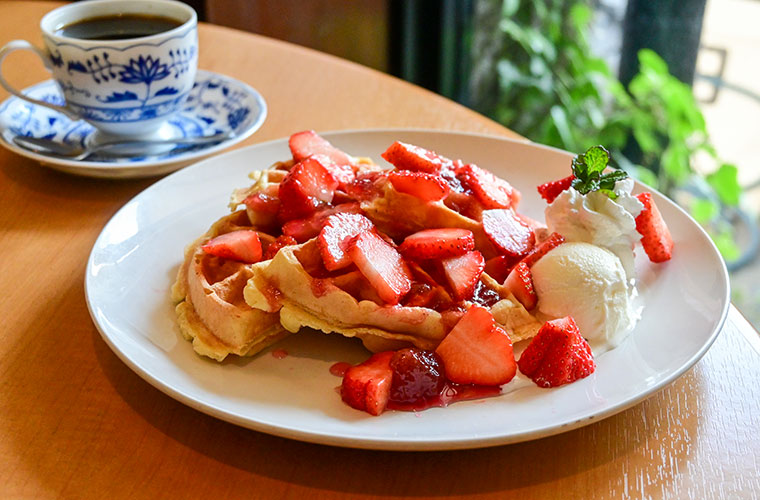 中でも人気なのが、季節限定の『イチゴのワッフル』。ふわふわでもっちりとした焼きたてワッフルに、甘酸っぱいイチゴとたっぷりのソースをトッピング。ひんやりとしたアイスやコクのある生クリームを絡めながら味わう、贅沢な一皿です。見た目も華やかで、思わず写真に収めたくなる一品です。