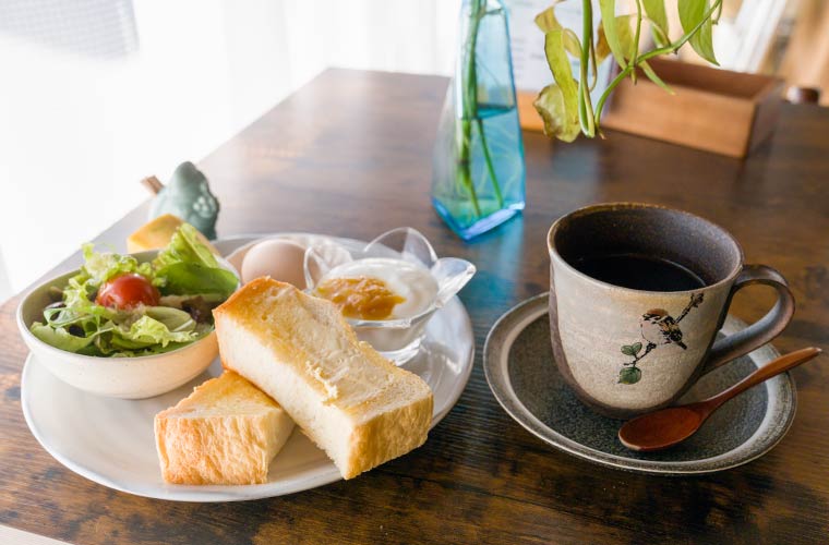 朝8:30〜11:00まで楽しめる『モーニングセット』。もっちりとした厚切りトーストは、多可町に移住してきた「パン工房 kiki」のパンを使用。小麦の香りがふわっと広がり、充実した朝食を楽しめます。