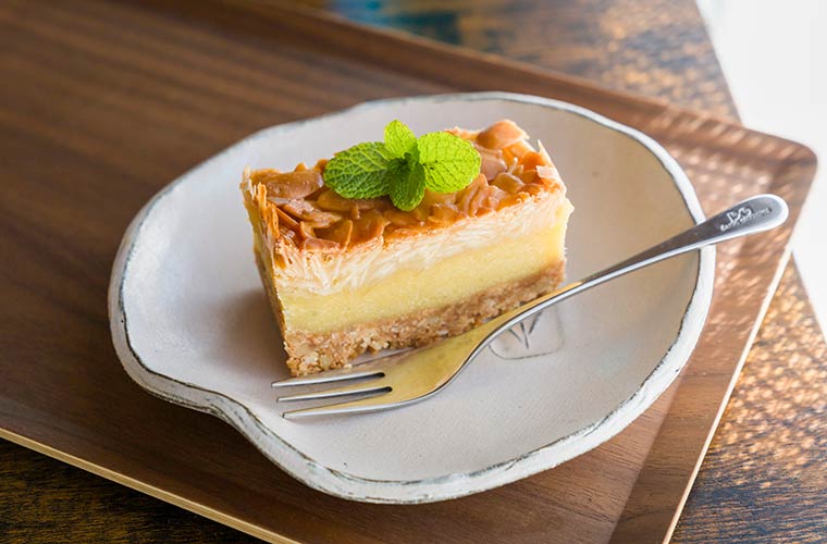 週替わりで内容が変わる『ケーキセット』。取材日は『さつまいものスイートポテトタルト』が登場し、アーモンドスライスをのせて2度焼きすることで、香ばしさとコクを引き出しています。ほくほくとしたサツマイモの甘さと、ナッツのキャラメリゼの風味が、口いっぱいに広がります。サクサクのタルト生地との食感の違いも楽しく、ほっとひと息つきたいときにぴったりのスイーツです。