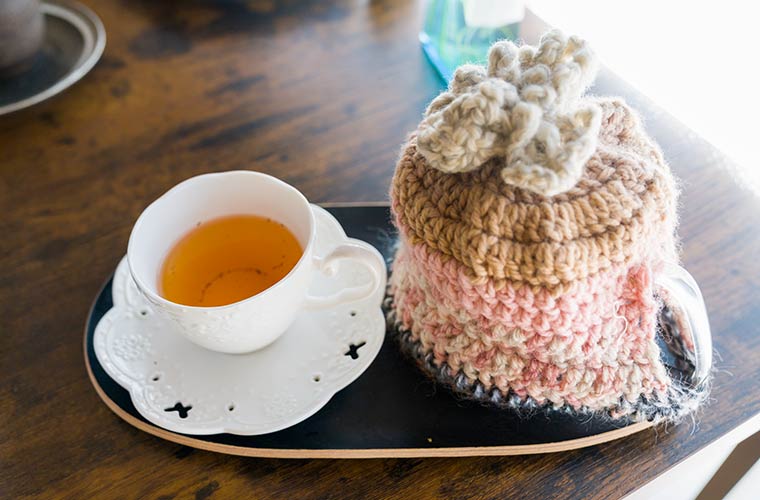 品の良い香りに包まれる『ハーブティー』。丹波氷上のハーブ園から仕入れた茶葉を使用し、ユズとジンジャーをブレンドしています。寒い時期にはジンジャーを多めに配合し、体の内側から温まる味わいに。店主手作りのティーポットカバーもかわいらしく、見た目にも癒やされる一杯です。