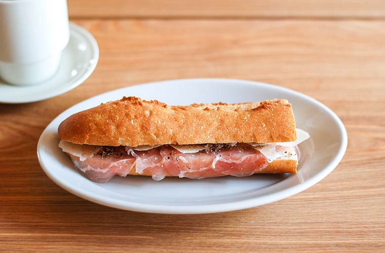 ライ麦と国産小麦のバゲットを使用した風味豊かなサンドイッチも人気。「生ハム&パルミジャーノ」「生ハム&焼き茄子」「オイルサーディン&キャロットラペ」の3種類があり、どれもちょっぴり塩気の利いた味わいでコーヒーによく合います。