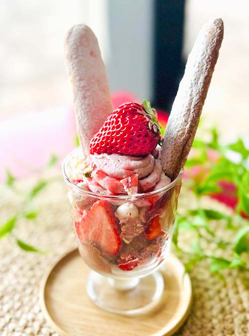 毎年ブラッシュアップされるイチゴパフェ。2026年は、“うさ耳モチーフ”で登場。ビスキュイを耳に見立てた愛らしい見た目に、ヴァローナのショコラジェラートやイチゴソースなど、手作りにこだわったトッピングがたっぷり。ビスキュイに付けながら味わえば、より一層楽しめます。