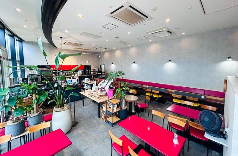 2025年5月に内装を全面リニューアルし、グレーと赤を基調としたスタイリッシュな空間へと一新。大きなガラス張りの窓からやわらかな日差しが差し込み、どの席にいても明るく心地よい雰囲気に包まれます。