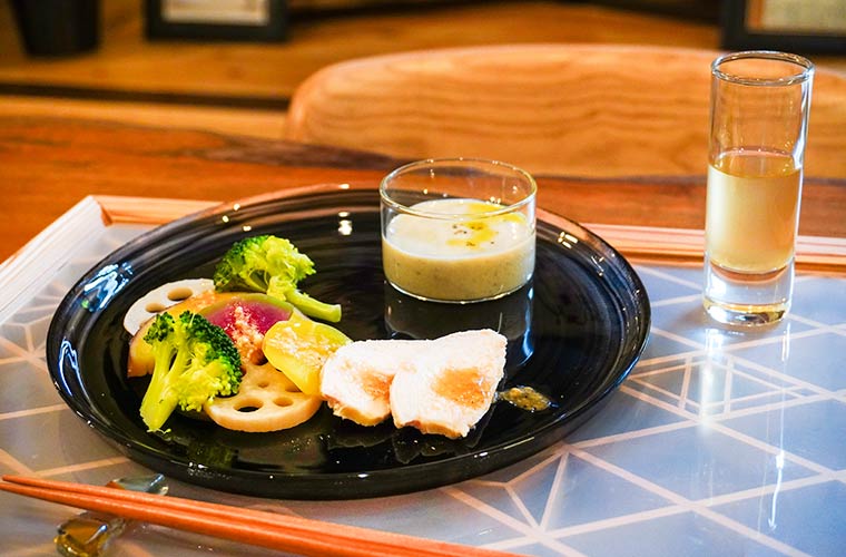 横に添えられた「キクイモのポタージュ」もほどよく濃厚で、根菜ならではの風味が蒸し野菜の甘みにマッチ!蒸し野菜をディップして味わうのもおすすめです。