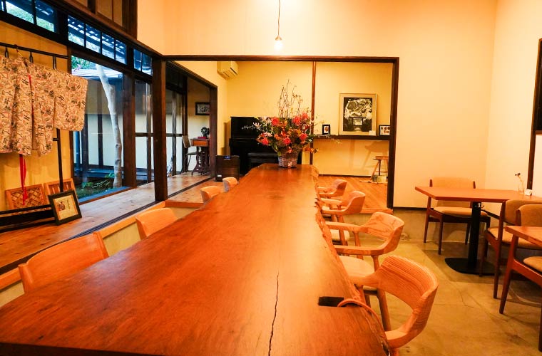 かつて産婦人科だったこの建物を、当時の面影をところどころに残しながらカフェ空間へとリノベーション。天井に新しく設えた格子の意匠や、材木屋さんが目利きして用意してくれたという、長さ5.8メートルにもなる大きな一枚板を使った特注の大テーブルなど、ノスタルジックな雰囲気の中に店主や材木屋さんのセンスとこだわりが光ります。