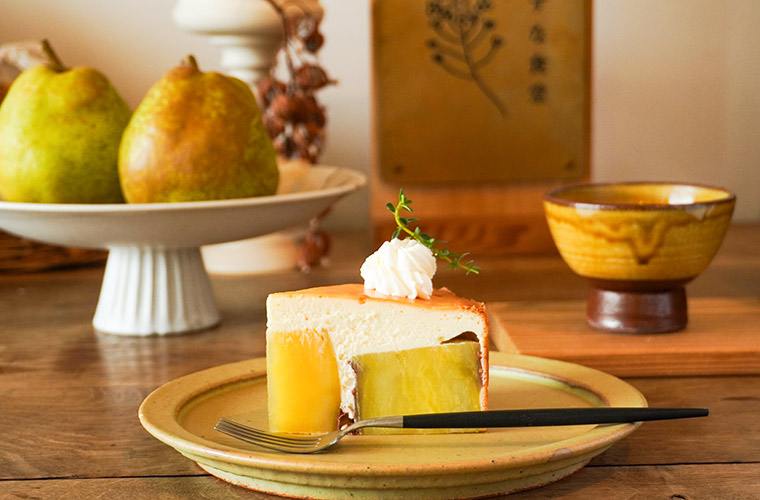 “ほぼサツマイモ”という名前の通り、チーズケーキの中にごろっと大きなサツマイモの甘煮を忍ばせた一品。このサツマイモは小野市産で、ホクホクとした食感と優しい甘さが特徴です。一方のチーズ生地は甘みを控えて後口をサッパリと仕上げた軽やかな味わい。同時に口へと運ぶことで、甘みとコクがほどよく重なり合う調和の取れた味わいが完成します。