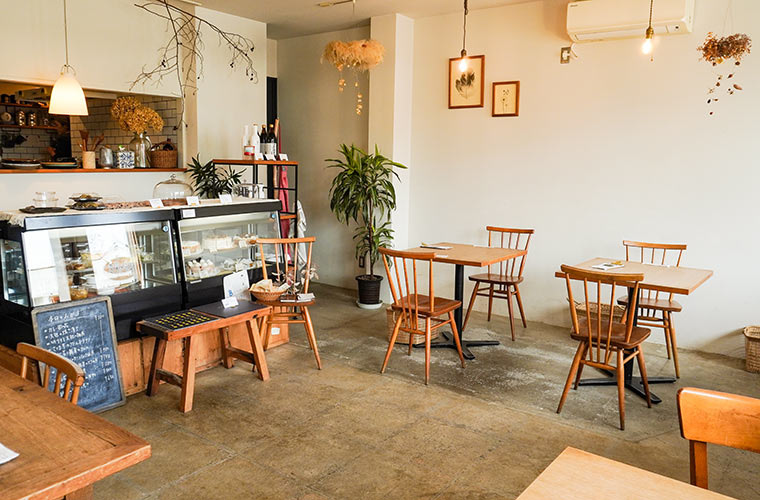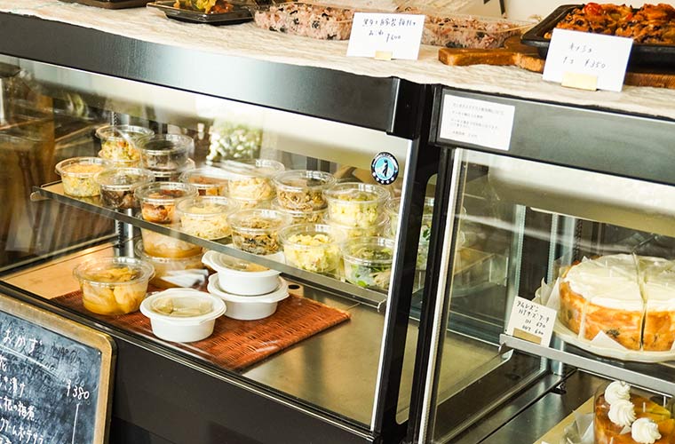 扉を開けると正面のショーケースには、季節の野菜が主役の惣菜や自家製ケーキがずらりと並びます。どれも素朴でシンプル。それでいて、思わず惹きつけられるような魅力が一つひとつに宿っています。