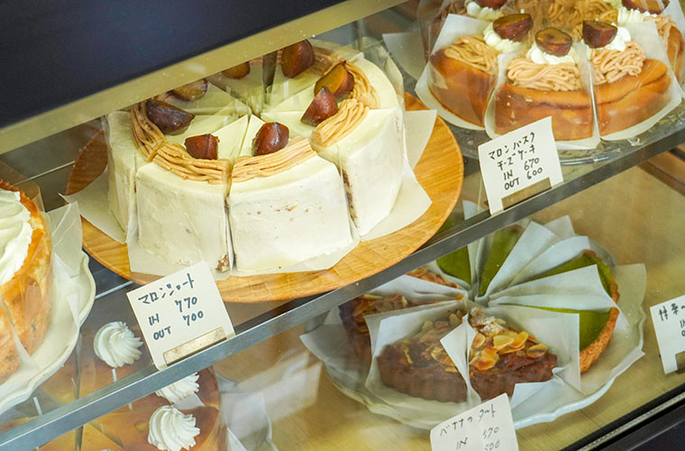 惣菜が並ぶショーケースの横には、自家製ケーキ専用のショーケースももう一つ用意されています。ここには常時5種類ほどのケーキがずらり。シーズンごとに変わる色鮮やかなスイーツに目を奪われます。テイクアウトはもちろん、店内で味わうこともできます。