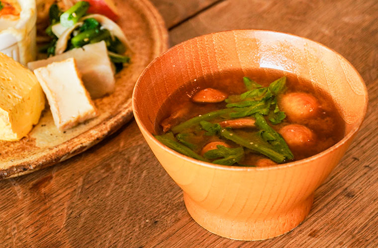 取材日のみそ汁の具材は、自家農園で採れた春菊と、山形の庄内地区から産地直送してもらったという大きな「鳥海(ちょうかい)なめこ」。特になめこは、これまでに出合ったことのないような大きさとうま味、そして食感に、思わず感動を覚えるほど。思わず「また食べたい」と心に刻まれてしまう、忘れがたい一椀です。