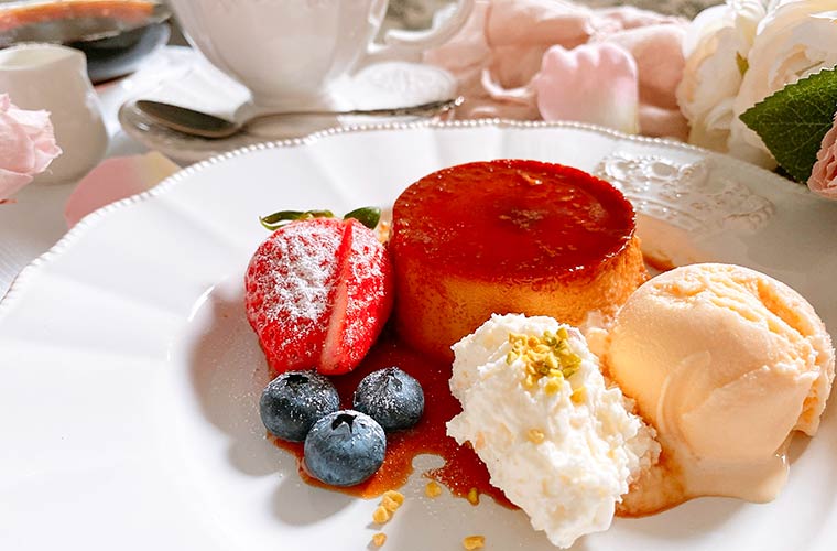 スイーツはどれも、素材そのものの味を生かしたシンプルなものが多く、ほっこりと心が和む優しい味わい。中でも、通年提供される定番人気の『クラシックカスタードプリン』は、ちょっぴりレトロなしっかりめの食感と、ほんのり苦みのあるカラメルとのバランスが絶妙で、クセになるおいしさです。
