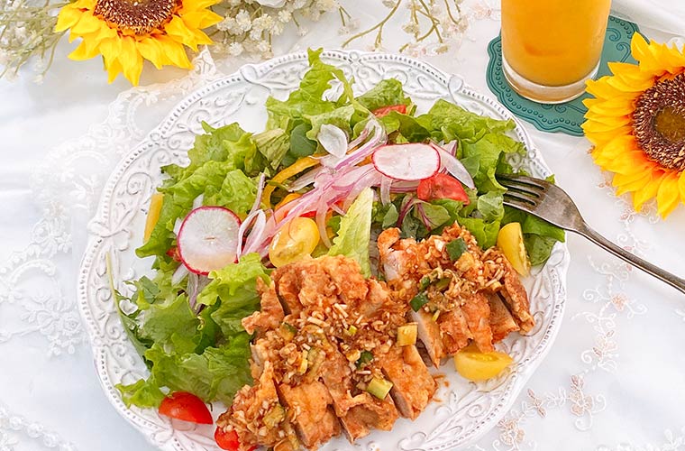 メインのおかずは「エビマヨ」や「ユーリンチー」など、魚介なのかお肉なのかも店主の気まぐれ次第で、なにが登場するかはお楽しみ♪カリッと香ばしく揚げたチキンの上に、甘酢を絡めたネギダレをたっぷりのせた「ユーリンチー」は、ほどよく酸味が利いて箸が止まらないおいしさです。雑穀米はもちろん、野菜との相性も◎。