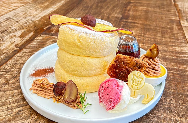 秋は、毎年この時期を楽しみにしているファンも多いという限定スイーツ『モンブランパンケーキ バニラアイス添え』がラインアップ。「播州地卵」を使いふっくら焼き上げたパンケーキ2枚を、たっぷりのマロンクリームでわき出る噴水のようにデコレーション。大粒栗の渋皮煮やチョコレートを飾りつけ、美しいモンブランパンケーキに仕上げています。