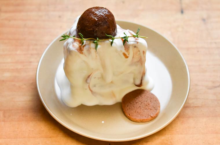主役の栗ミルクアイスは、黒糖香るミルクアイスに栗ソースを絡めた濃厚な味わい。その下には、なめらかなカタラーナアイスやティラミスと、サクサク食感のシュガーパイやココナッツクッキーなどの焼き菓子が層をなし、食感のコントラストを楽しめます。