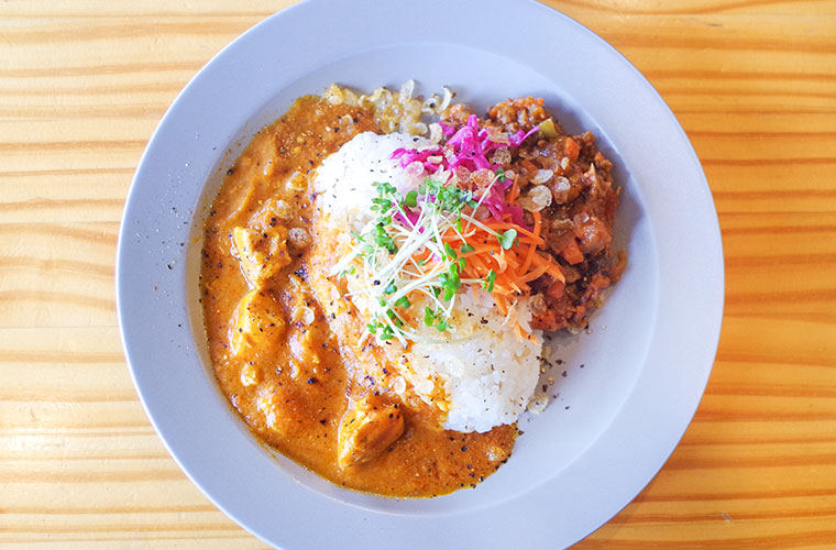刻んだ野菜とリンゴをたっぷりと使った『キーマカレー』は、うま味と甘みが凝縮されたコク深い味わい。ハチミツ・みそ・みりんなどで味付けされていて、どこか和食のような風味の奥ゆきも持ち合わせています。『バターチキンカレー』は、じっくり火を通してペースト状にしたタマネギやニンジンがベースになっているので、クリーミーな中にも甘さが際立っています。塩麹(こうじ)で漬けたやわらかい鶏肉がごろっと入っていて、食べ応えも十分。