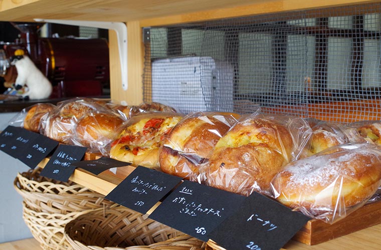 オーナーが焼くパンが店頭に並ぶ日も。菓子パンから惣菜パンまで、8種類ほどのラインアップです。店内でのイートインもOK。