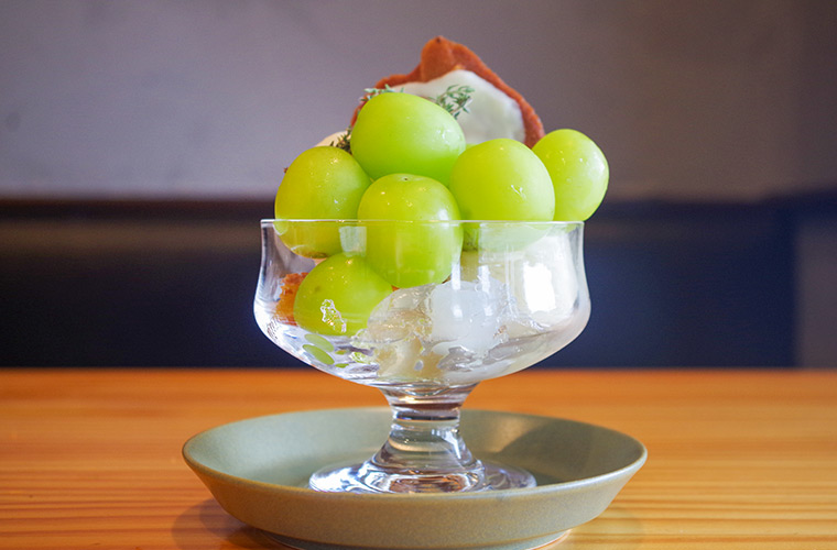 グラスの底でキラキラと輝いているのは、ナタデココを入れたゼリー。マスカットのみずみずしさも相まって、全体的にさっぱりとした後口なので、食後のデザートにもピッタリです。