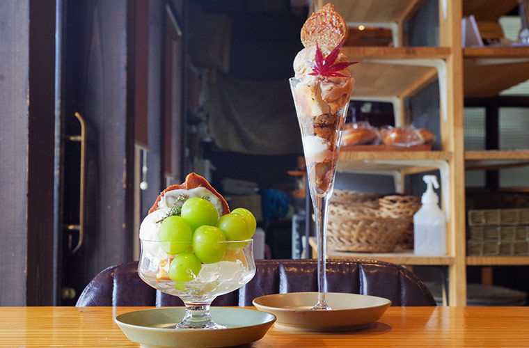 同店の1番人気は、アイスからソース、トッピングの焼き菓子まで、すべて手作りにこだわったパフェ。季節ごとに変わるメニューが常時4種類ほどスタンバイしていて、9月からは、『栗パフェ』が、10月からは『マスカットと杏仁のパフェ』がスタートしました。