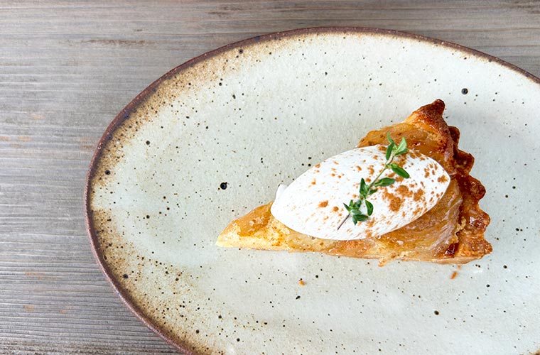 ナイフを入れると、中に忍んでいたバターと天然ハチミツがじゅんわり。甘いトッピングがさっぱりとしたリンゴと見事に調和していて、まさにほっぺが落ちるおいしさ!これを目当てに来店する人もいるほど、ファンの多い一品です。オーダーが入ってから焼き上げるので、ランチ後のデザートにいただく人は先に注文を忘れずに。