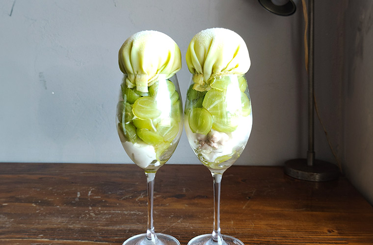 「RU cafe(ルーカフェ)」の代名詞とも言える「クレープ包みパフェ」に、ブドウの王様・シャインマスカットverが新登場!