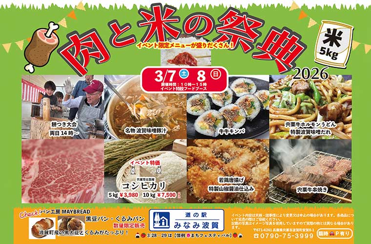 宍粟の“うまい”が大集合!3月7日(土)・8日(日)の2日間、道の駅みなみ波賀で「肉と米の祭典2026」が開催されます。主役は、宍粟が誇るブランド和牛の「宍粟牛」と宍粟市北部で栽培される「コシヒカリ(白米)」。さらに、「波賀味噌」や「波賀町産黒大豆」など地元食材を存分に味わえる2日間です。