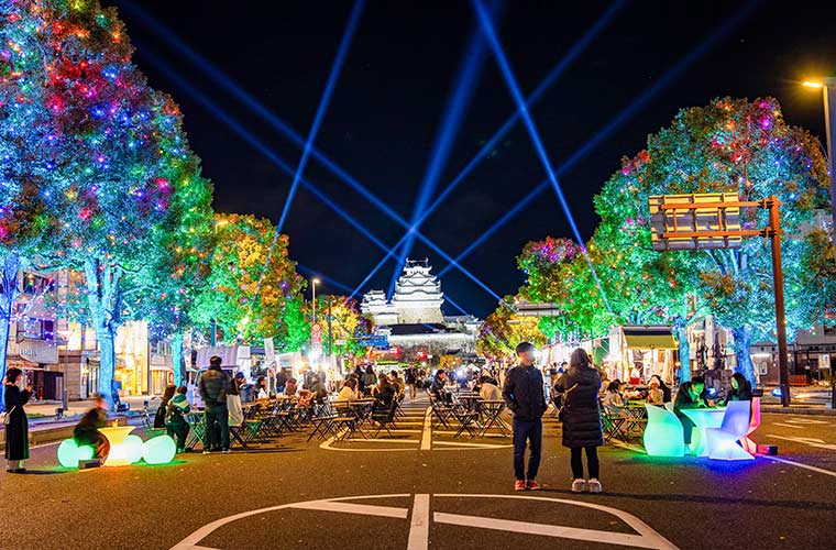 期間限定で大手前通りの一部(国道2号から城南線まで)が歩行者天国に。歩行者専用道路に規制されるので、道路の中央で姫路城とイルミネーションのコラボをゆったりと楽しめます。
