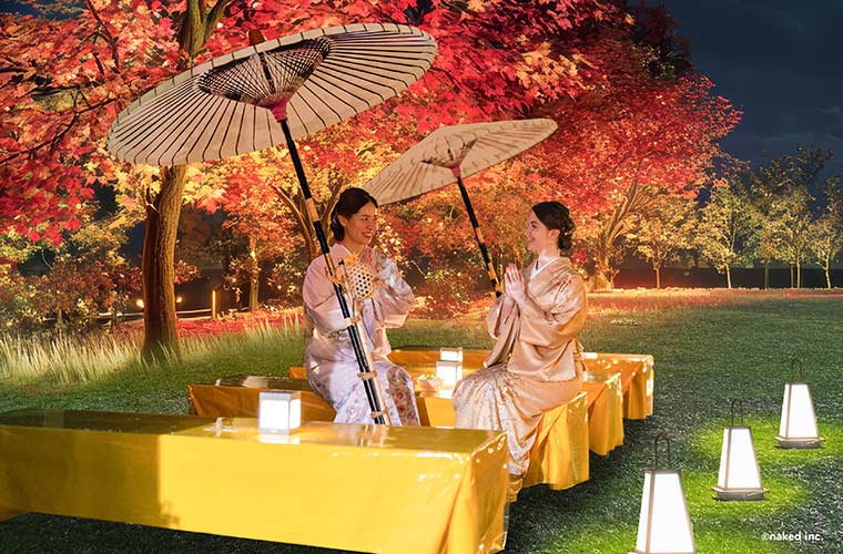 さらには、アートオブジェと連動して三の丸広場周辺の木々に設置されたライトが変化し、会場全体が幻想的なアート空間に。姫路城を眺めながら憩いのひとときを過ごす「和傘カフェラウンジ」や、有料コンテンツ「提灯型デジタルインスタレーション」、お花をモチーフとした「おみくじ」もあります。