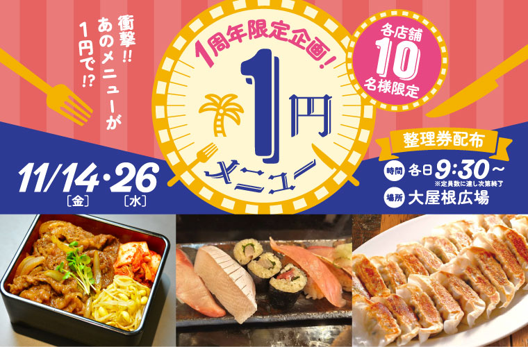 「1周年限定1円メニュー」では、約20店舗の館内飲食店がおすすめする看板メニューを“1円”で味わえるお得なチャンス!神戸焼肉 田の『和牛焼肉重』(通常1,628円)や、札幌魚川岸 いきいき寿司の『ブリ5点盛り』(通常1,050円)などの人気メニューが数量限定で1円に!1周年祭のスタートである14日(金)と、グランドオープン1年記念日の26日(水)限定で開催されるので、詳細は公式HPを要チェック。
