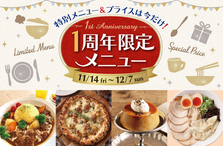 また、各飲食店から1周年を記念した限定メニューや特別価格メニューがスタンバイ♪喫茶 太陽コンパスの『太陽コンパスブレンドの珈琲プリン』(850円)やPOP UPラーメンの『博多豚骨スペシャルワンタンメン』(1,430円)など、この期間だけの特別グルメを逃さず味わってみて。