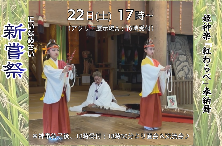 22日(土)は、秋の実りに感謝する「新嘗祭(にいなめさい)」の奉納式典が執り行われます。神楽舞、日本舞踊、剣舞にお箏、小鼓、法螺貝(ほらがい)などの演奏も。新米おにぎりやおでん、多国籍領ブースやキッチンカーも登場するので、食欲の秋を堪能して♪