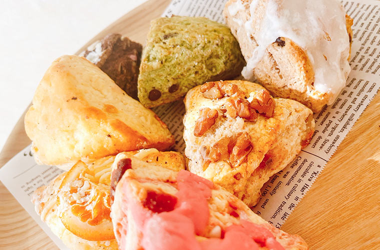 同店の人気商品『スコーン』は、独自の配合で素材の味と食感を楽しめる一品。全10種のフレーバーがそろい、どれも温めることで、より一層おいしさが引き立ちます。また『キャロットケーキ』は、鳥取県産のニンジンを使用し、甘さ控えめでしっとりとした味わいに仕上げています。おすすめの果物を一緒に焼き込んでいるのもポイント。