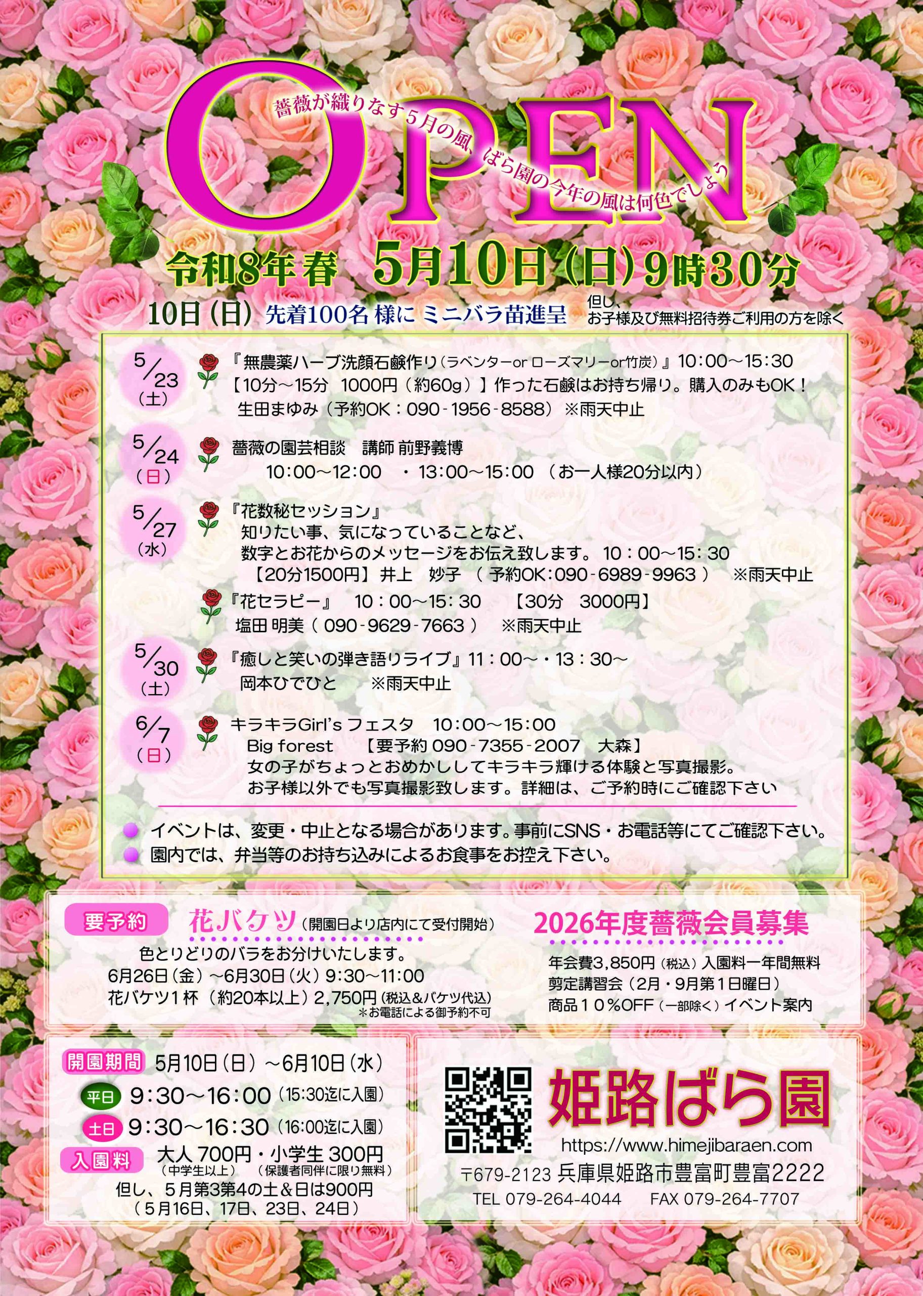 春と秋の年2回、バラが見頃の時期に開園する「姫路ばら園」。約750種、3,300株のさまざまなバラが楽しめると話題のスポットです。2026年は5月10日(土)〜6月10日(水)に、春のオープンを迎えます。