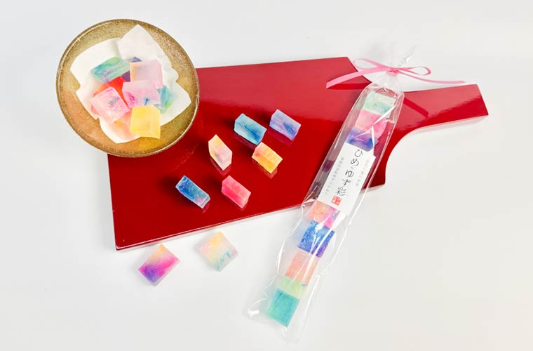 寒天をゆっくりと固め、カラフルな色を丁寧に重ねて仕上げるこのお菓子は、まるで宝石を磨き上げるかのように、一つ一つ丹精を込めて作られます。手間と時間を惜しまず作られた琥珀糖は、口に含むと外はシャリッと、中はふわりとほどけるような優しい口溶け。その儚い食感が、見た目の美しさとともに、食べる人の心を優しく満たしてくれます。