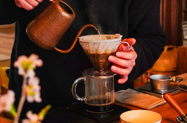 コーヒーは、一杯ずつ丁寧にハンドドリップで抽出。雑味が出ないようお湯の温度管理を徹底し、豆の種類に合わせて細やかな調整を行いながら、常に最高の一杯を追求しています。