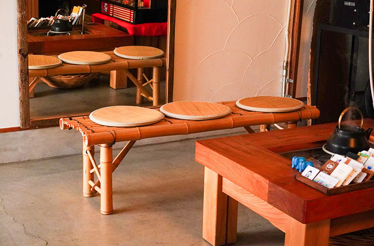 さらに、土間の中央にはどこか懐かしさを感じる囲炉裏が据えられています。その前にも2人掛けのベンチ席があり、思い思いに過ごせるくつろぎの空間が広がっています。時間の流れがゆるやかに感じられる、居心地の良い店内です。