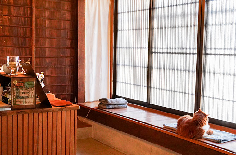 店内に一歩足を踏み入れると、まず広がるのは開放感のある土間空間。ここはお客さんが利用できるイートインスペースになっています。窓際には大人4人が並んで座れるベンチ席が設けられ、やわらかな光が差し込む中でゆったりとした時間を過ごせます。運が良ければ、お店のアイコンにもなっている2匹の猫が顔を見せてくれることも。