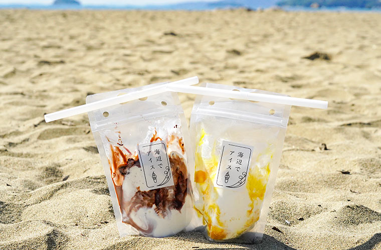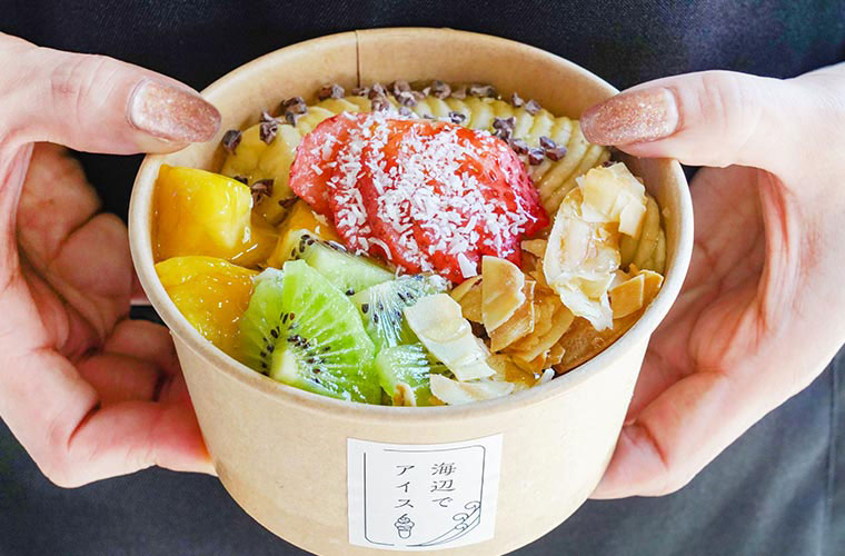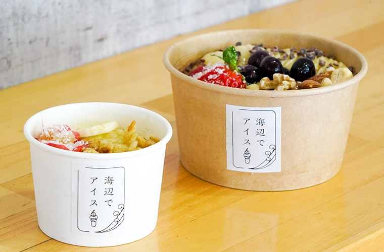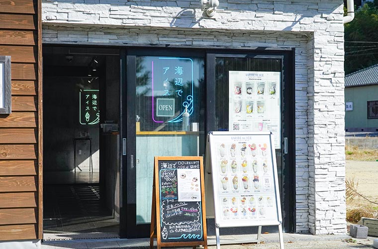 たつの市の新舞子浜の目の前に店を構える「海辺でアイス」。看板メニューのソフトクリームのほか、秋冬はアサイーボウル、春夏はかき氷も提供しています。